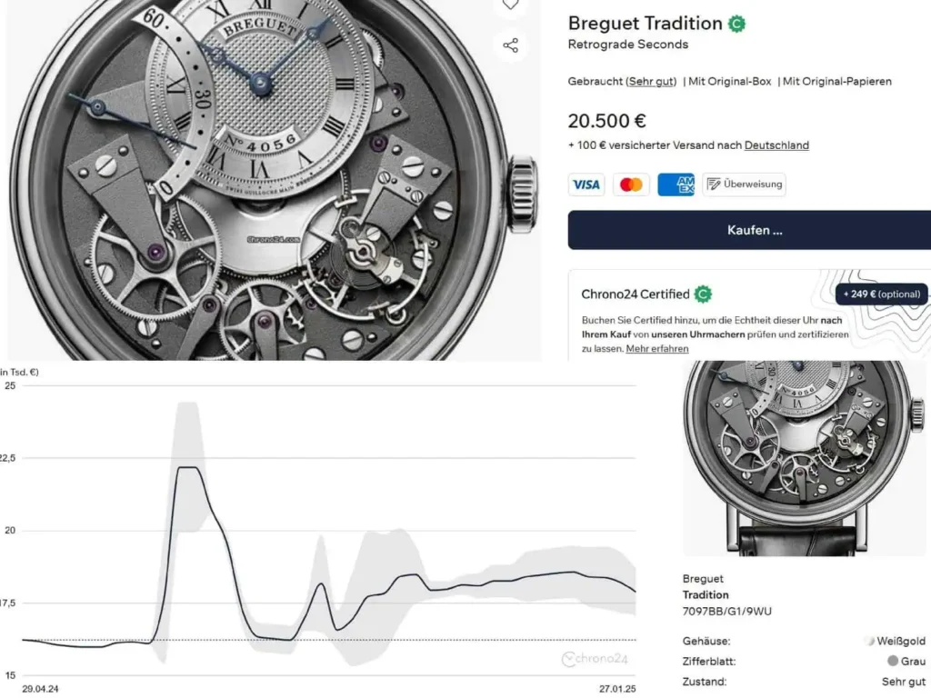 Zur ausgeprägten Schwäche am chinesischen Markt gesellt sich noch ein weiteres Manko der Swatch Group. Es besteht darin, dass deren Topmarken Blancpain, Breguet, Glashütte Original und Jaquet Droz im Orchester des uhrmacherischen Luxus allenfalls in den hintersten Bänken sitzen. Breguet, 2025 genau 250 Jahre alt, fällt immer weiter hinter Mitbewerber wie A. Lange & Söhne, Audemars Piguet, Patek Philippe oder Vacheron Constantin zurück. Eine deutliche Sprache für geringe Begehrlichkeit bei Sammlern und Liebhabern hochwertiger Zeitmesser sprechen niedrige Preise am Sekundärmarkt. Beispielsweise ist die Tradition 7097 dort für weniger als die Hälfte der unverbindlichen Preisempfehlung zu haben.