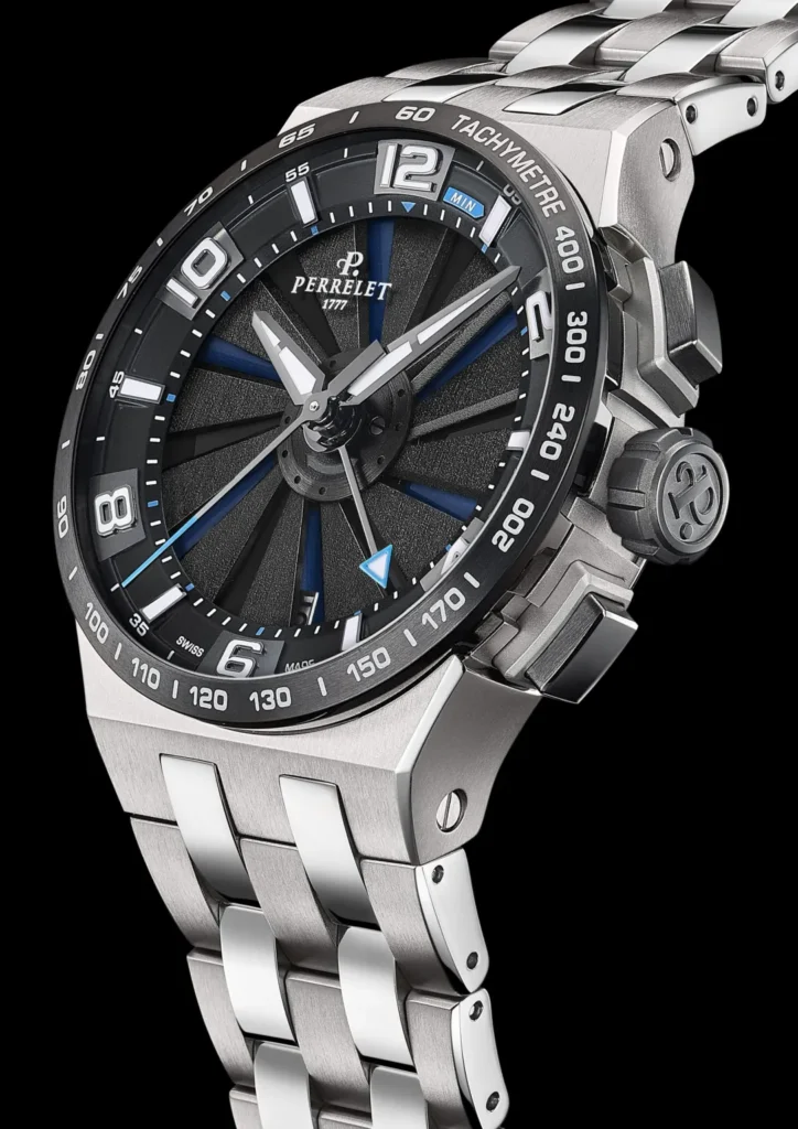Die Turbine Chrono Neo ist in einem Gehäuse aus poliertem/gebürstetem Titan Grad 2 untergebracht, das an den Stil der Perrelet Turbine EVO erinnert, dem Modell, das 2019 anlässlich des 10-jährigen Jubiläums der Turbinentechnologie die Erneuerung dieser berühmten Linie markiert. Der Gehäusedurchmesser wurde von 47 mm beim Vorgängermodell auf 42 mm reduziert.