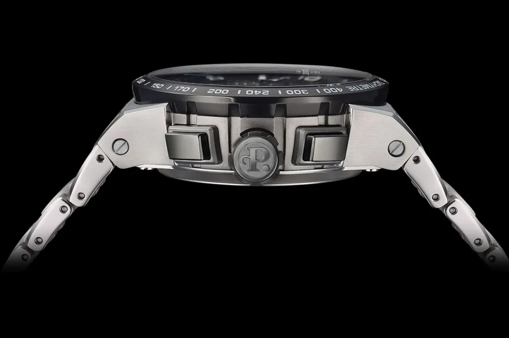 Sie ist wasserdicht bis 5 atm und hat einen Gehäusemittelteil, der durch breite Rillen gekennzeichnet ist. Dieselben Rillen finden sich auch auf der schwarzen Krone, die ausgestellt und mit dem lasergravierten „P“ des Logos personalisiert ist.