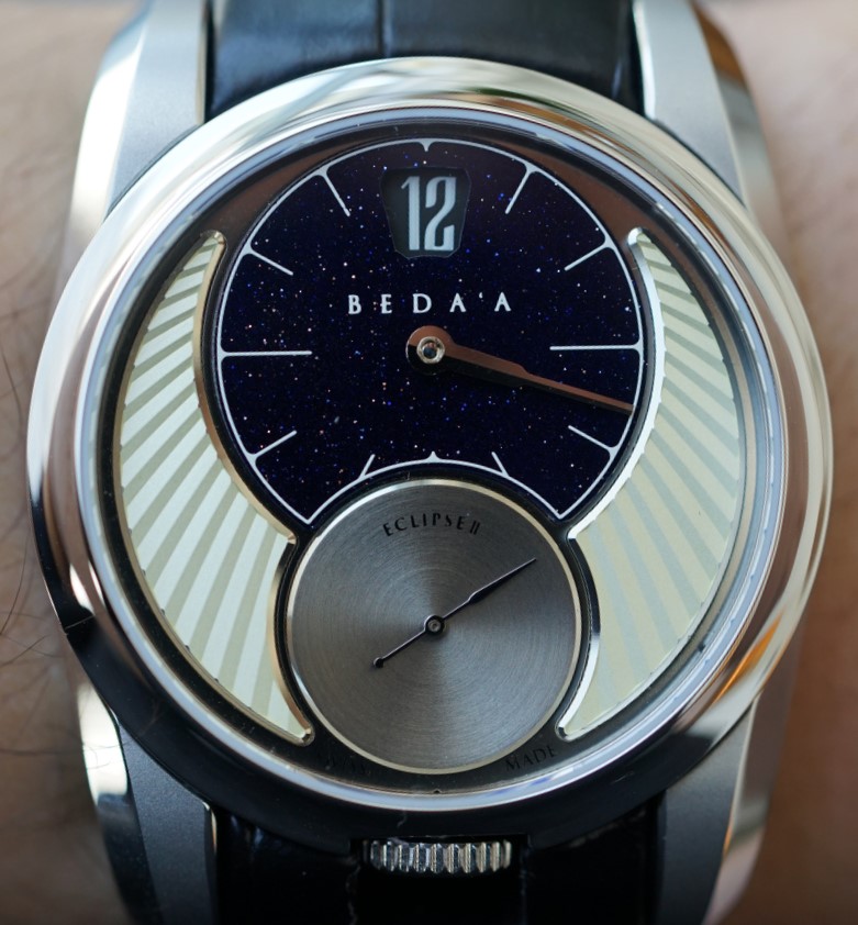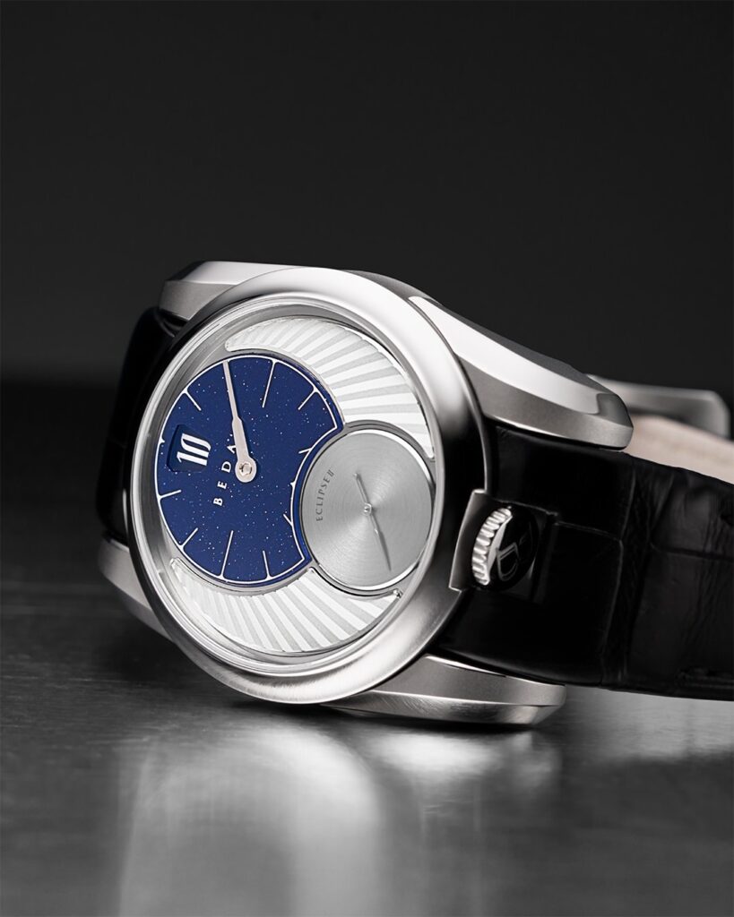 Für dieses zweite Kapitel fügt Beda’a ein Modul hinzu, das gemeinsam mit der Spezialwerkstatt Dubois Depraz entwickelt wurde. Das für seine Komplikationen bekannte Familienunternehmen wurde 1901 im Vallée de Joux gegründet. Es verfügt über eine unbestreitbare historische Legitimität, gepaart mit beispielloser technischer Expertise. Dank ihnen konnte Beda’a eine Eclipse II mit einem Durchmesser von nur 37 mm entwerfen, die durch eine Höhe von unter 10 mm (genau 9,5 mm) perfekt ausbalanciert ist.