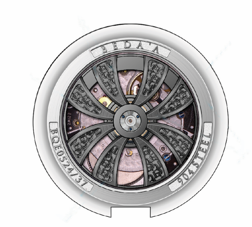 Das himmlische Thema setzt sich auch im durchbrochenen Rotor fort, einer Rarität für sich. Acht dreidimensionale Rotorblätter, satiniert mit einem strahlenden Motiv; Jedes Rotorblatt ist in der Mitte mit Beda’as stilisiertem „B“ graviert; Jedes polierte Emblem thront auf einem lasersandgestrahlten Hintergrund und spiegelt die raffinierten Wechselwirkungen des Stahlgehäuses wider. Beda’a hat hier einen durchbrochenen Rotor von seltener Raffinesse entworfen.