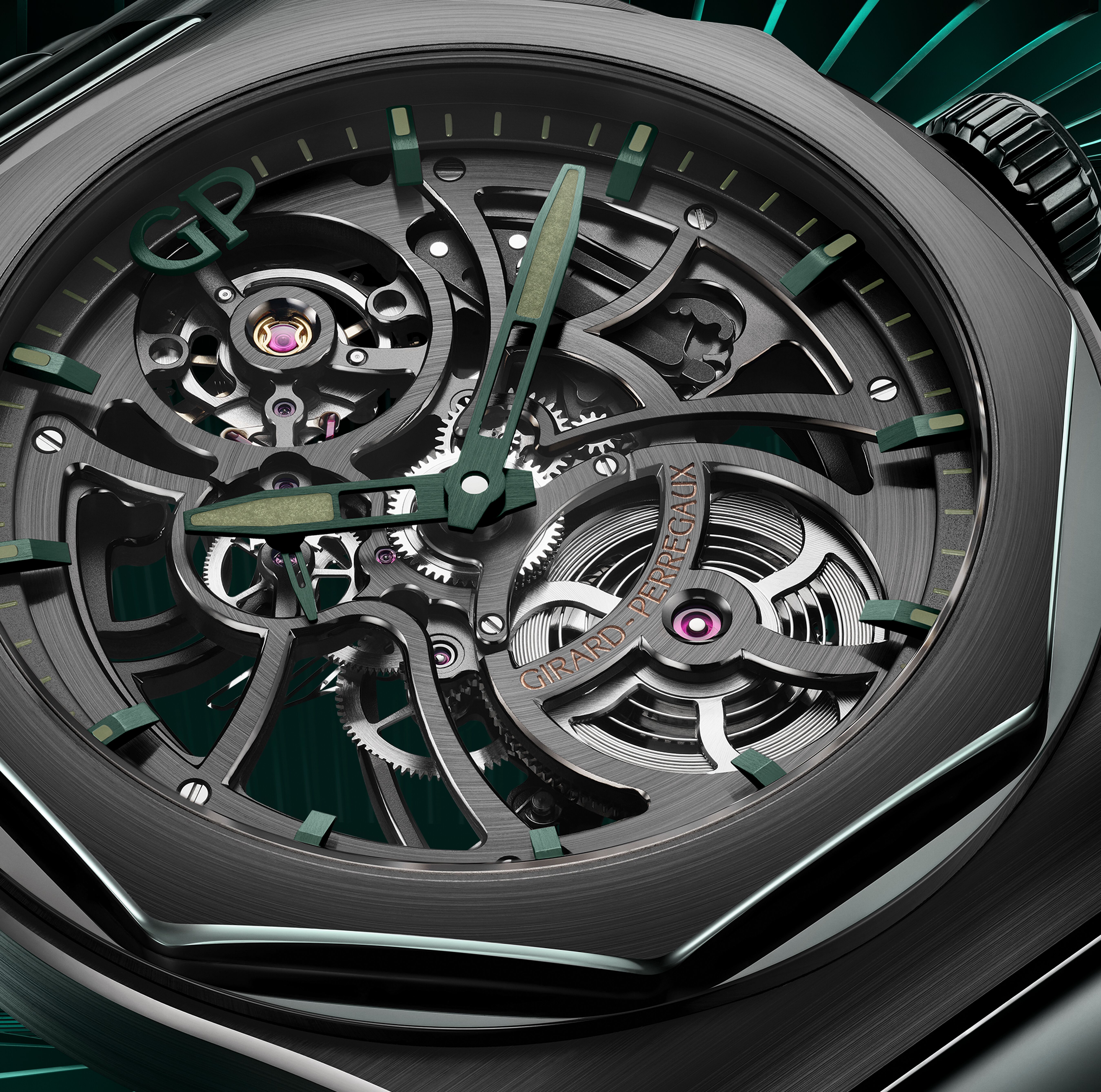 UHRWERKGP inhouse Kaliber GP01800, mechanisches Werk mit automatischem Aufzug und grün PVD-beschichteter Schwungmasse aus Roségold