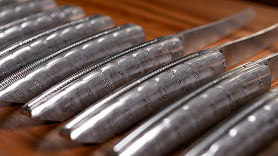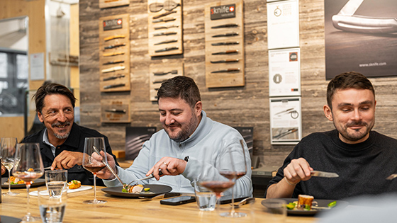 Mercedes-Benz Schweiz lud ihre Kunden ein, um neben Fahrerlebnis und Kulinarik im Jura auch Messerhandwerkskunst in Biel zu entdecken. Die Führung durch die Messermanufaktur begeisterte – die Liebe zum Detail, Präzision und handwerkliche Fertigung machen jedes Messer zu einem Unikat. Die Führung wurde mit einem Apero mit regionalem Jumi-Käse abgerundet. Abends boten die Spitzenköche Guy Ravet und Silvio Germann im Château de Raymontpierre den Gästen eine raffinierte kulinarische Reise. Elegant eingedeckte Tische mit unseren sknife Messern boten den stilvollen Rahmen dazu.