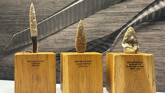 Unsere neue Ausstellung bereichert die Besichtigung und gibt einen Einblick in die Entstehung des Messers, dem wichtigsten Werkzeug der Menschheit. Die 3 Trouvaillen aus Silex wurden vom Paläontologen Kevin Chartier nach alter Technik für uns hergestellt.