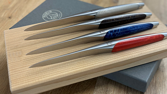 Die sknife Messer aus Chirurgenstahl und stabilisiertem Holz sind auch in der luxuriösen Variante aus Damaszenerstahl und mit Griffen in diversen Farbvarianten erhältlich, passend zum Interieur oder – wie beim Fussballclub Paris Saint-Germain – zu den Logo-Farben. Diese Version verdanken wir der Bestellung von Clubbesitzer Nasser Al-Khelaifi, der in einem Restaurant in Paris auf unsere Steakmesser aufmerksam geworden war.