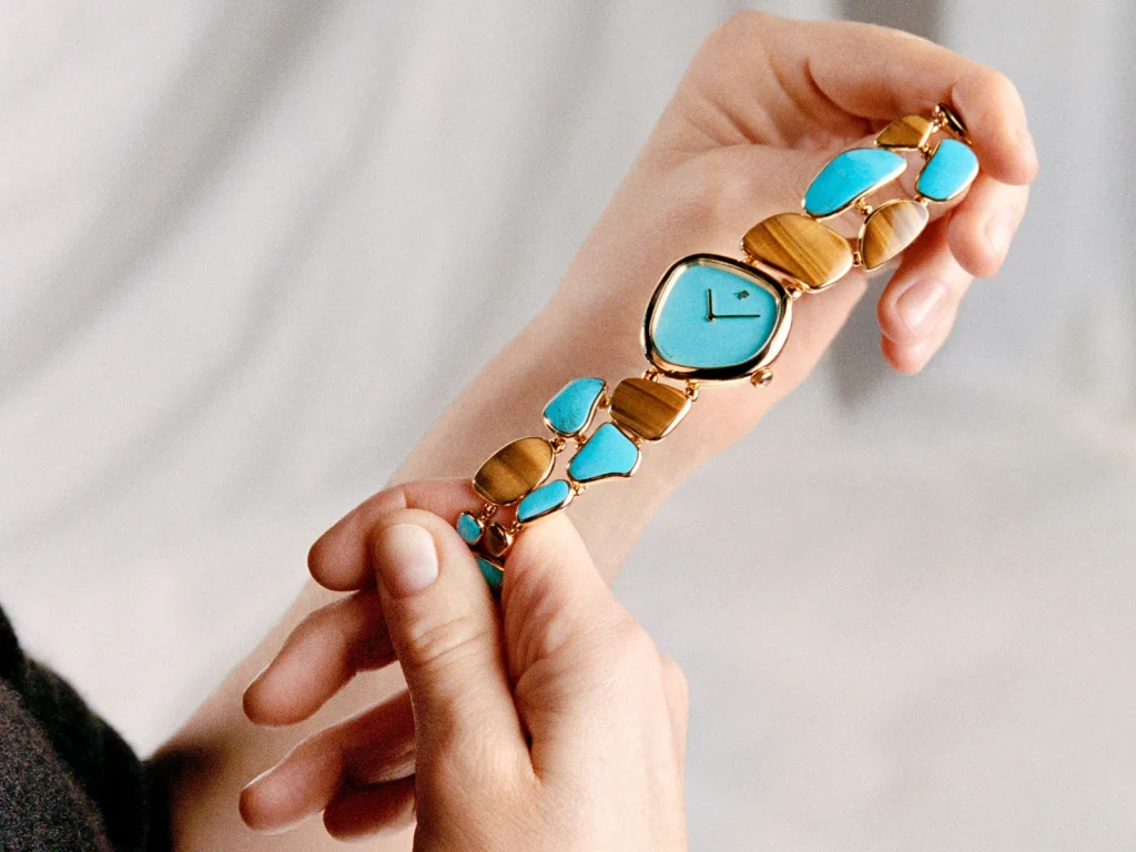 Dann wäre da noch die Galets mit ihrem türkisfarbenen Zifferblatt. Sie kommt den Uhren, die wir sonst aus dem Hause AP gewohnt sind, am nächsten. Die Inspiration für dieses Schmuckstück lieferte das unberührte Wasser des Lac de Joux, daher auch die Farbe und die Form des Gehäuses und der Glieder des Armbands, die an von der Naturgewalt geschliffene Steine erinnern sollen. Für das Zifferblatt wurde absichtlich auf Indizes verzichtet, um so dem Naturstein mehr Raum zu geben und eine Art meditative Beziehung zur Zeit zu kommunizieren.