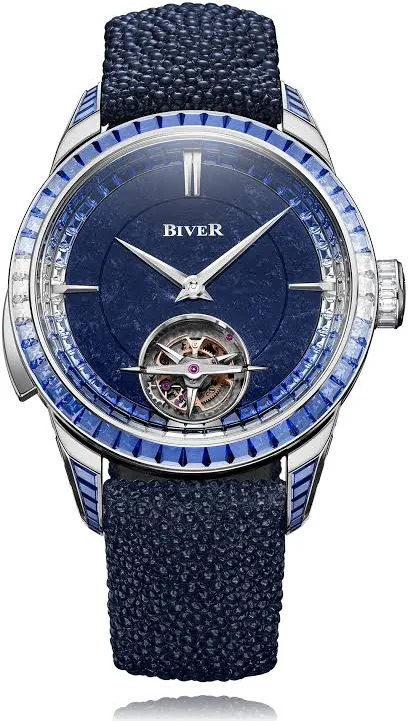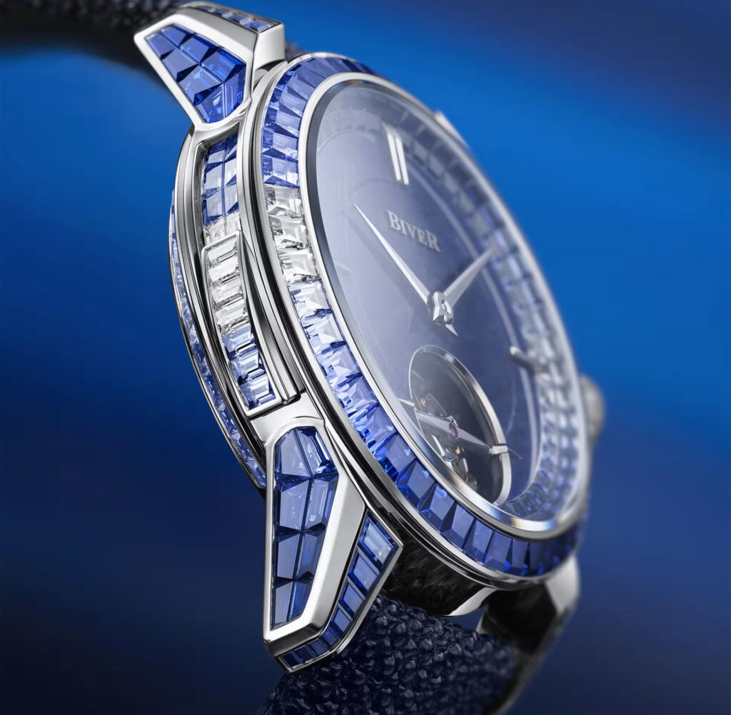 Biver Armbanduhr, Einzelstück Tourbillon Carillon, 43 mm, goldgrau,. Armband, mit Faltschliesse, Zifferblatt: automatische Sodalit, Kaliber JCB.001-A, Saphireis, mit Wiederholungsminuten, Saphire, insgesamt: 30,52 ct. Ref.: PRF-00070, Preis CHF 1’384’00.00 (inkl. MWSt)
