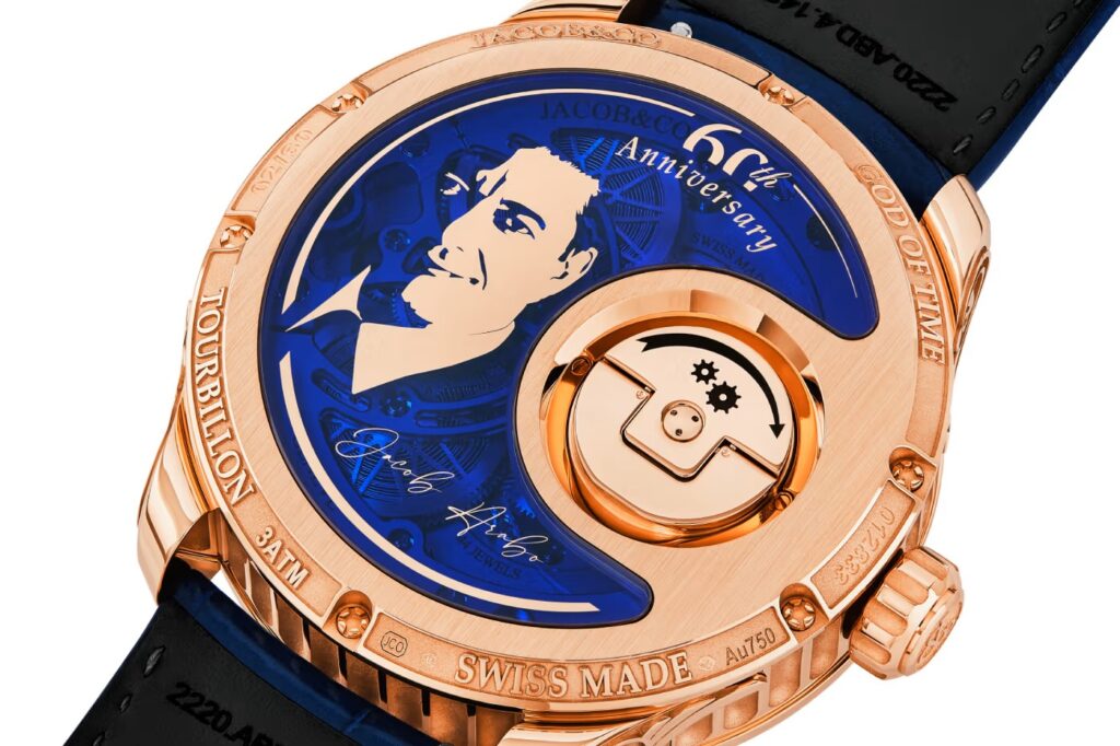 Auf der Rückseite zeigt der Saphirglasboden nicht nur das Kaliber, sondern auch das Porträt von Firmengründer Jacob Arabo samt Signatur – ein persönlicher Verweis auf seinen 60. Geburtstag, zu dem diese Uhr entstanden ist.