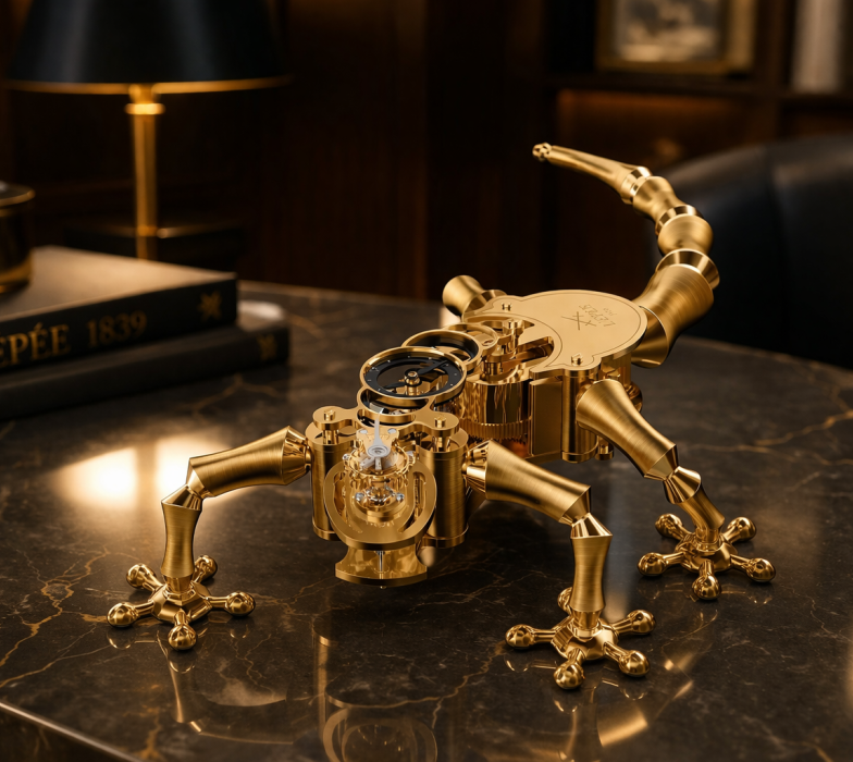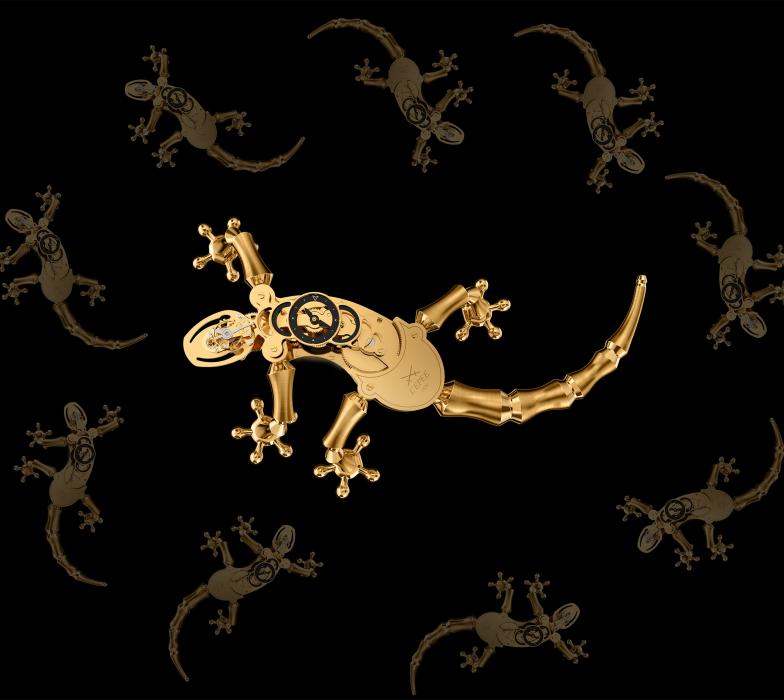 The Gekko geht einen völlig anderen Weg, als die klassischen Uhrenherstellter. Statt Uhrengeschichte ist hier Naturgeschichte das Bezugssystem. Die Tischuhr nimmt die Form eines Geckos an, 290 Millimeter lang, 180 Millimeter breit, 1,4 Kilogramm leicht. Beine, Schwanz und Körper sind aus lackiertem Messing und Edelstahl gefertigt, satin-poliert an Extremitäten und Schwanz, mit besonderer Lackiertechnik am Körper. Das skelettierte Manufakturwerk mit 220 Komponenten und 11 Steinen sitzt im Rumpf des Tieres und ist vollständig einsehbar. Das Hemmwerk ist in den Kopf des Geckos integriert. Die Platzierung hat symbolischen Gehalt, wobei L’Epée hier nicht überdeutlich wird. Das Zifferblatt trägt eine feine Metallstruktur, die sich an der Textur echter Geckogehaut orientiert. Ein rotierender Ring erlaubt es, die Zeitanzeige je nach Lageposition des Tieres neu auszurichten, damit die Lesbarkeit in jeder Lage erhalten bleibt. Das ist der vielleicht intelligenteste technische Detail des Objekts: The Gekko lässt sich in zehn verschiedenen Wandpositionen montieren oder frei stehend aufstellen. Das Wandmontagsystem ist dazu in eine neutrale Halterung integriert, die das Tier selbst nicht verändert. Die Zeiteinstellung erfolgt über einen dedizierten Schlüssel an der Unterseite, das Aufziehen über den seitlich beweglichen Schwanz. Erhältlich ist The Gekko vollvergoldet, in Schwarz/Silber und in Champagner.